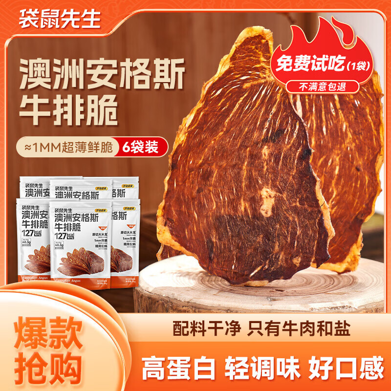 袋鼠先生安格斯牛排脆片原味25g*6袋健康解馋脆脆牛肉干休闲零食薄脆片