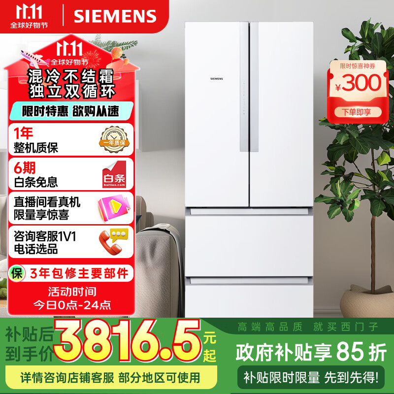西门子(SIEMENS)484升 变频混冷多门四门大容量家用冰箱 家电国家补贴 以旧换新 精细分储独立双循环白 KM48EA20TI