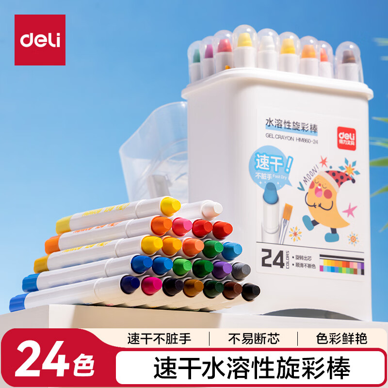 得力(deli)24色水溶性速干旋彩棒油画棒旋转出芯(混)(24色/筒)蜡笔炫彩棒套装幼儿画画国庆出游礼物HM860-24