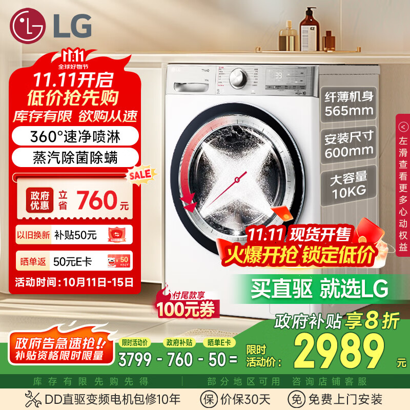LG小旋风系列 超薄滚筒洗衣机全自动 家用洗衣机10公斤大容量直驱变频 国家补贴以旧换新FCW10Y4WA