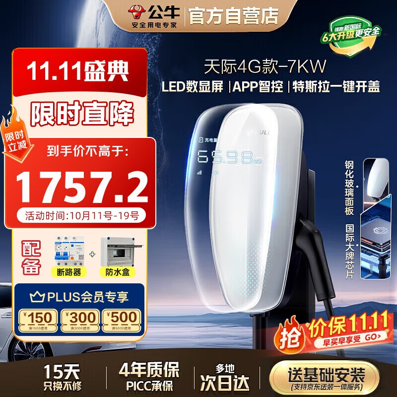 公牛(BULL)新能源汽车交流充电桩适配于小米su7/yu7汽车特斯拉比亚迪问界大众 新国标7KW天际4G款