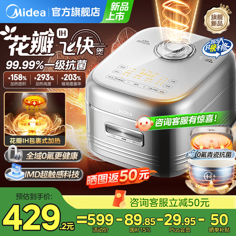 美的(Midea)花瓣IH电饭煲3-4-5人0釜抗菌青瓷鼎釜多功能家用智能电饭锅蒸煮一体煮粥杂粮饭4升大容量口感可调 4L 【全域0氟更健康】25年新款