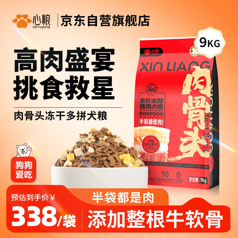 心粮肉骨头狗粮全价无谷冻干狗粮小中大型成犬幼犬通用犬粮9kg/18斤
