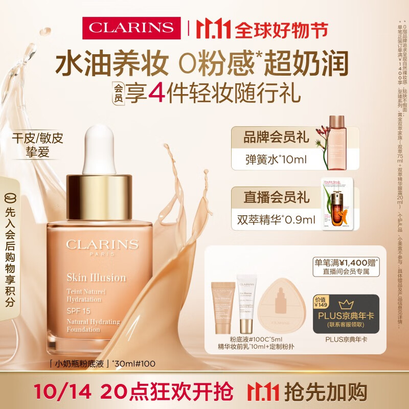 娇韵诗小奶瓶水漾精华粉底液30ml#100C冷白肤遮瑕彩妆礼物送女友