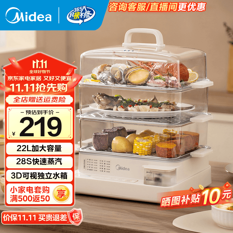 美的(Midea)电蒸锅电蒸箱家用蒸箱蒸汽锅多用途锅多功能蒸包子锅不锈钢蒸架电锅三层大容量全透明视窗 22L |三层不锈钢蒸架|ZGC322301