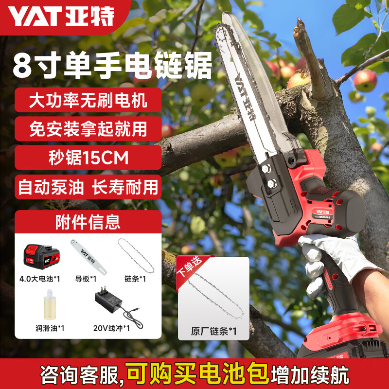 亚特(YAT)8寸锂电池大功率电锯家用小型手持伐木锯劈柴充电锂电无刷电链锯