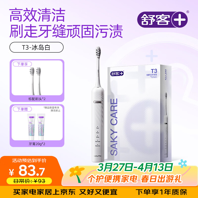 舒客 情侣电动牙刷成人/学生送男友/女友软毛护龈声波5档 生日礼物 T3小米白 牙刷