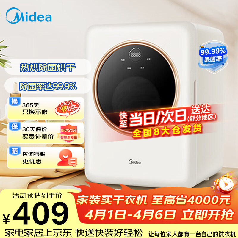 美的(Midea)烘干机家用小型护理机10颗灯珠内衣裤紫外线杀菌婴儿奶瓶多功能衣物消毒机MHJ22V01E