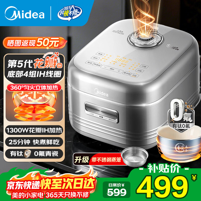 美的第5代花瓣IH加热电饭煲家用大容量4-5-8个人 有钛0氟陶瓷内胆不粘锅一级抗菌 快速饭柴火饭电饭锅 【1300w花瓣IH加热】新款0氟青瓷 4L