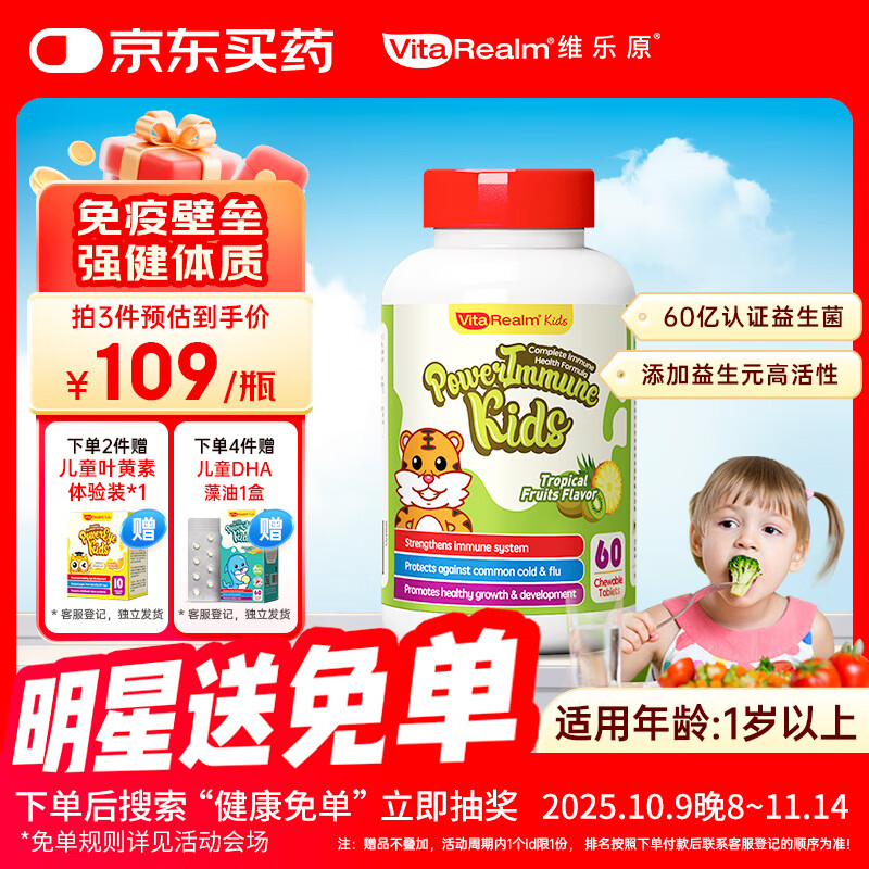 维乐原儿童多种复合维生素维B族锌30亿益生菌咀嚼片1-12岁60粒
