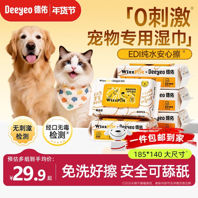德佑宠物湿巾80抽*5包 玻尿酸除臭湿纸巾EDI纯水猫狗通用舔舐无忧