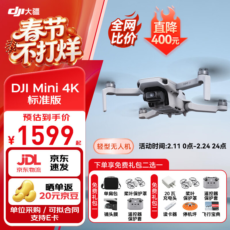 大疆Mini 4k 无人机入门级无人机航拍高清专业迷你长续航便携遥控飞机航拍机小型高清旅拍 10 公里新手 大疆Mini 4k 标准版【送原装桨保】 官方标配(无内存卡) 官方标配 官方标配1 送【单肩包 镜头膜 保护罩 遥控器套】