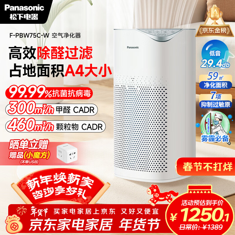 松下(Panasonic)家用空气净化器除甲醛 除菌除烟除过敏源异味轻音PM2.5数显小巧家用PBW75C礼品