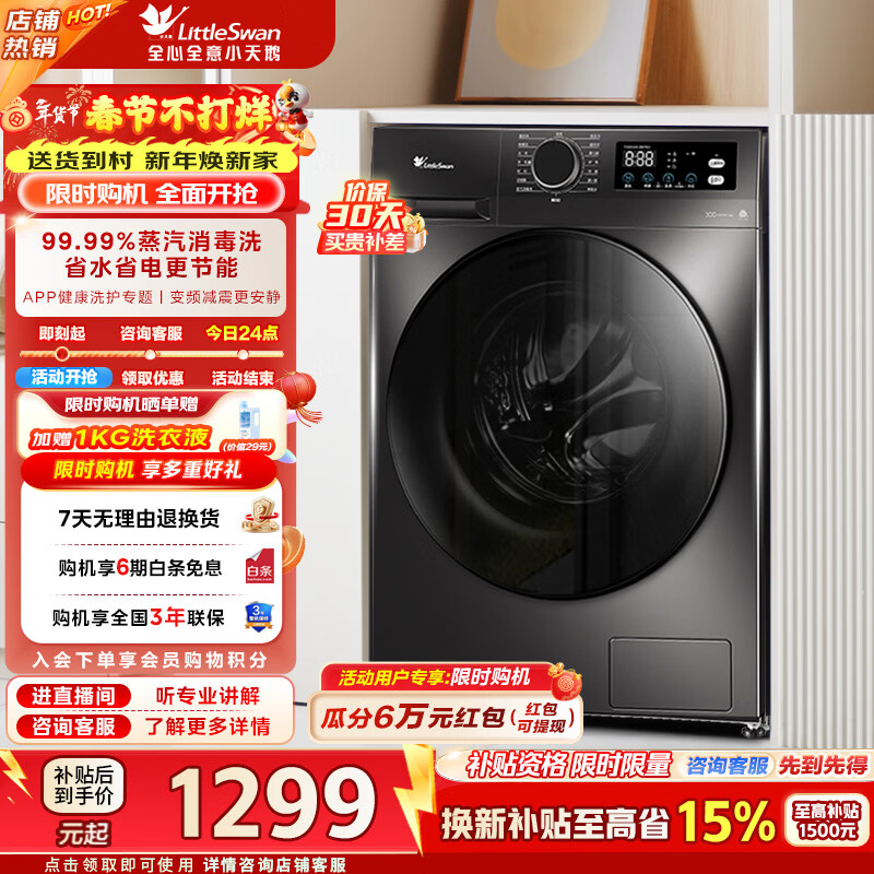 小天鹅(LittleSwan)10KG滚筒洗衣机全自动懒人超薄蒸汽消毒洗智能WIFI高温筒自洁家电补贴一级能效 TG100APUREPRO【1.1高洗净比】 滚筒