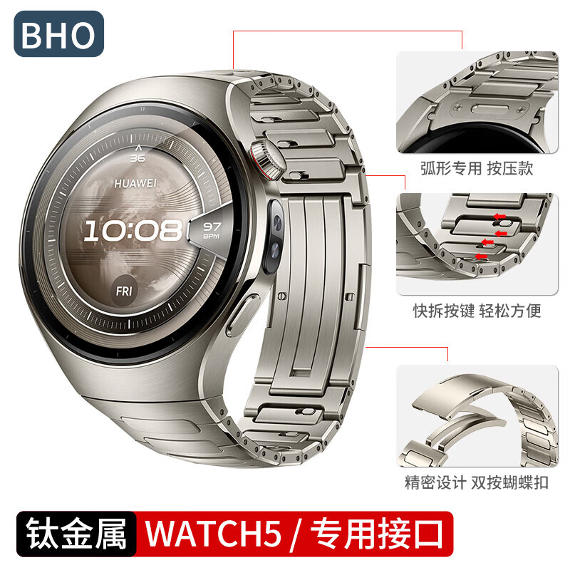BHO【官方同款】适用华为watch5表带钛金属钛空银按压式弧形工字watch5手表表带钛合金42/46mm男女款 【顶配真工字按压款】钛空银-弧形专用 适用:华为手表Watch5(46mm表盘)