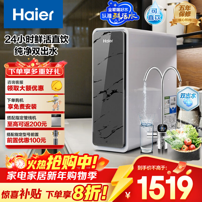 海尔(Haier)鲜活水pro1200G大通量双出水净水器RO反渗透抑菌膜家用厨房专用台下用自来水净饮直饮机
