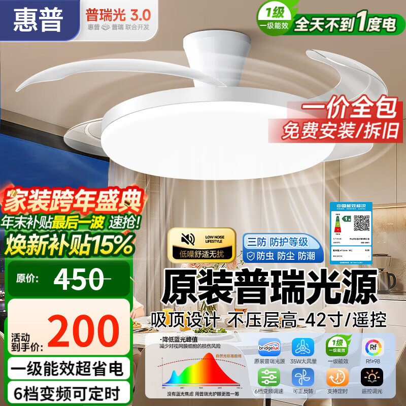 惠普风扇灯普瑞护眼LED隐形扇叶餐厅卧室遥控调光一体无叶吊扇灯中山 1级能效/吸顶42寸普瑞光/遥控无极
