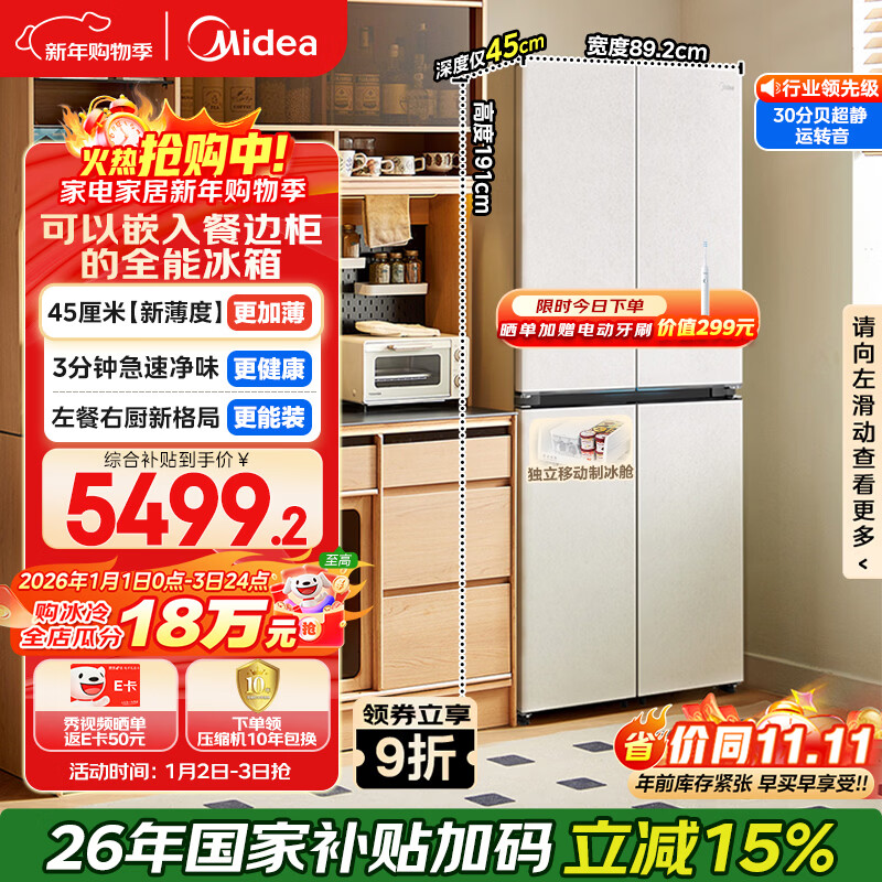 美的(Midea)餐边柜系列427L十字门45厘米薄嵌左餐右厨三循环一级能效风冷无霜以旧换新BCD-427WUSGPZM国家补贴
