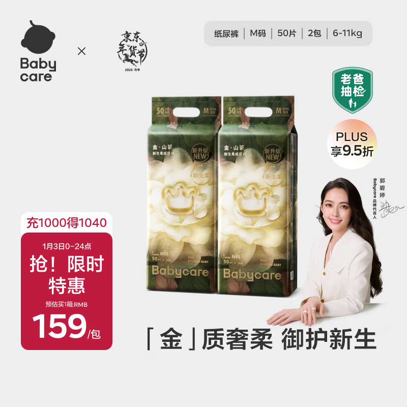 babycare金山茶花纸尿裤M50片*2包(6-11kg)婴儿尿不湿超薄透气轻柔花苞裤