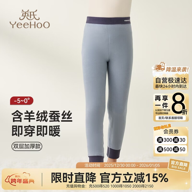英氏(YEEHOO)【羊绒蚕丝加绒秋裤】双层儿童保暖裤内穿青少年男女童校服神器