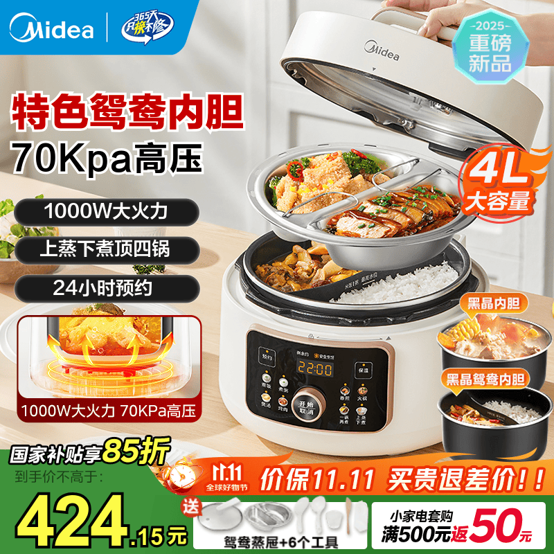 美的(Midea)电压力锅鸳鸯家用双胆高压锅4升分格智能预约开盖火锅煲汤煮饭锅彩屏触控电饭煲3-4-6人 【鸳鸯系列】创意一锅两煮 4L 家庭容量