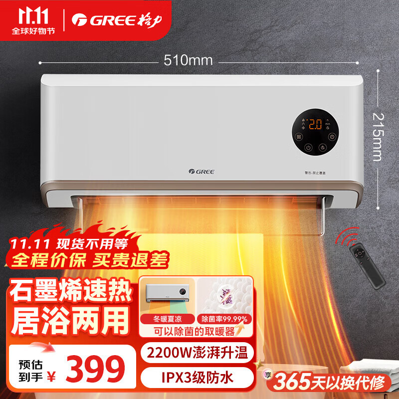 格力(GREE)石墨烯暖风机家用壁挂式速热电暖风取暖器 浴室防水热风机居浴两用浴霸电暖气可烘衣暖毛巾电暖器 NFBC-X7022B(遥控款)