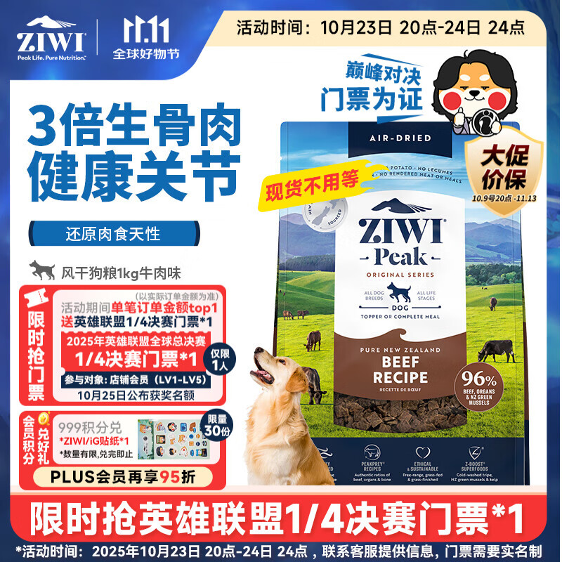 滋益巅峰(ZIWI)无谷风干狗粮1kg牛肉味主粮干粮犬粮成犬幼犬通用