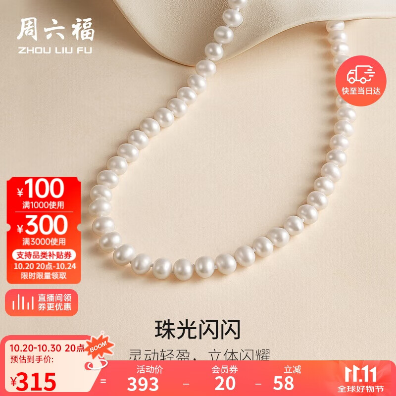 周六福S925银扣淡水珍珠项链妈妈生日礼物 扁圆7.5-8.5mm 45cm