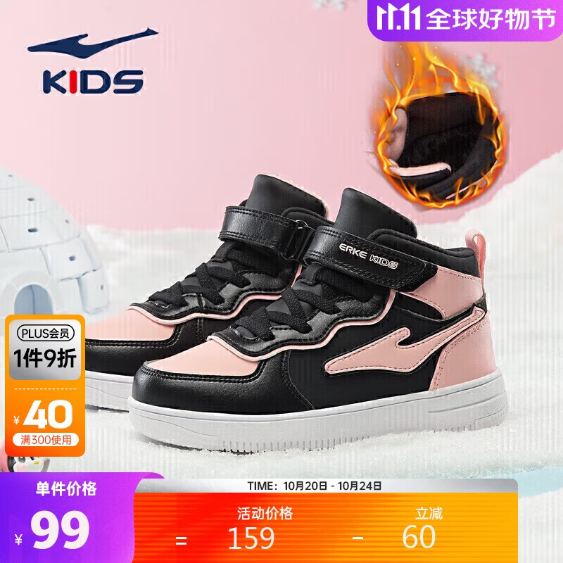 鸿星尔克(ERKE)童鞋女童大小童网面滑板鞋儿童加棉运动跑鞋正黑/矿物粉37