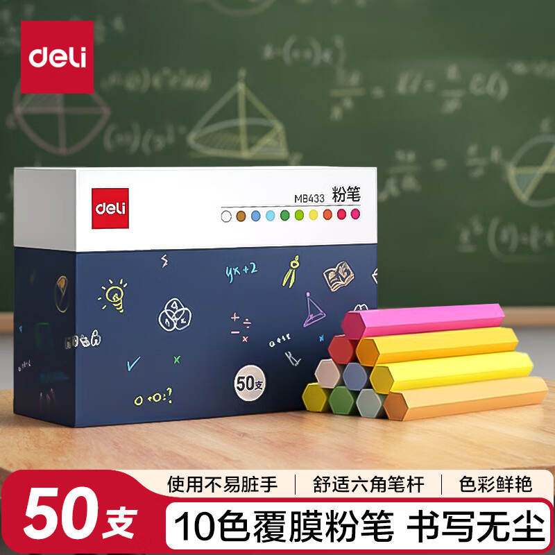 得力(deli)10色50支彩色粉笔无尘覆膜粉笔儿童家用黑板报专用六角笔杆不易脏水幼儿园涂鸦教学教师专用