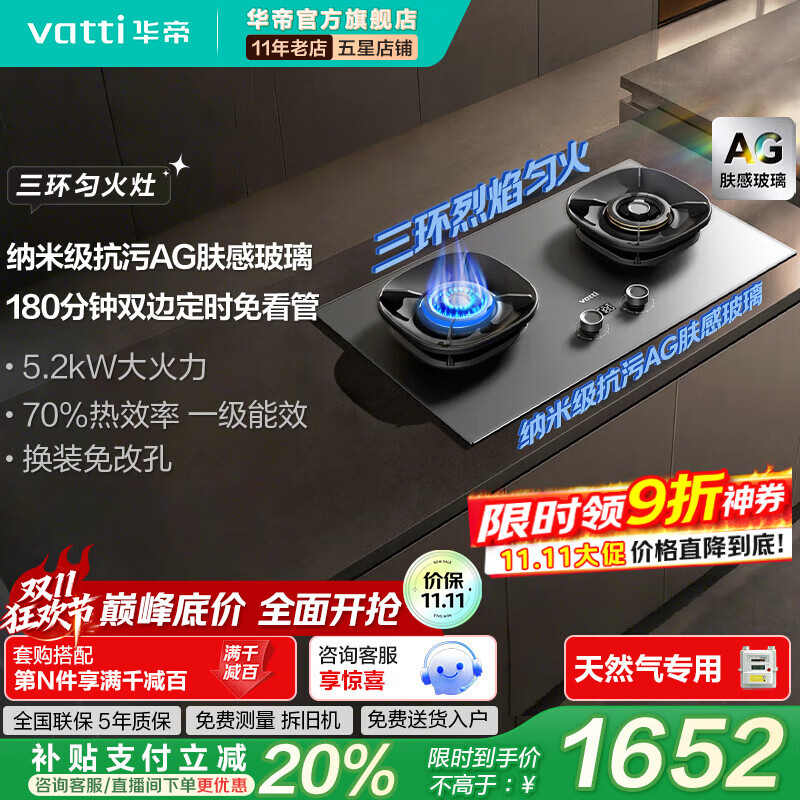 华帝(VATTI)i10308G【70%热效率+定时+AG玻璃】小飞碟Max燃气灶天然气嵌入式5.2kW煤气灶双灶台灶具 i10308G美学灶具【国家政府补贴】 天然气专用