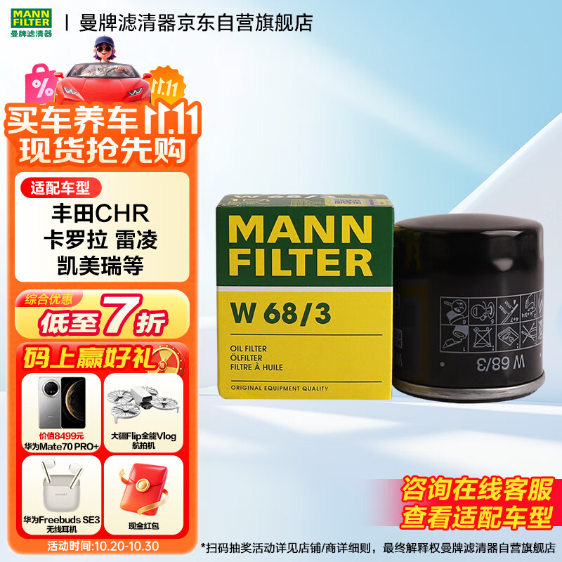 曼牌(MANNFILTER)机油滤清器机滤机油滤芯W68/3卡罗拉雷凌RAV4荣放花冠威驰致炫