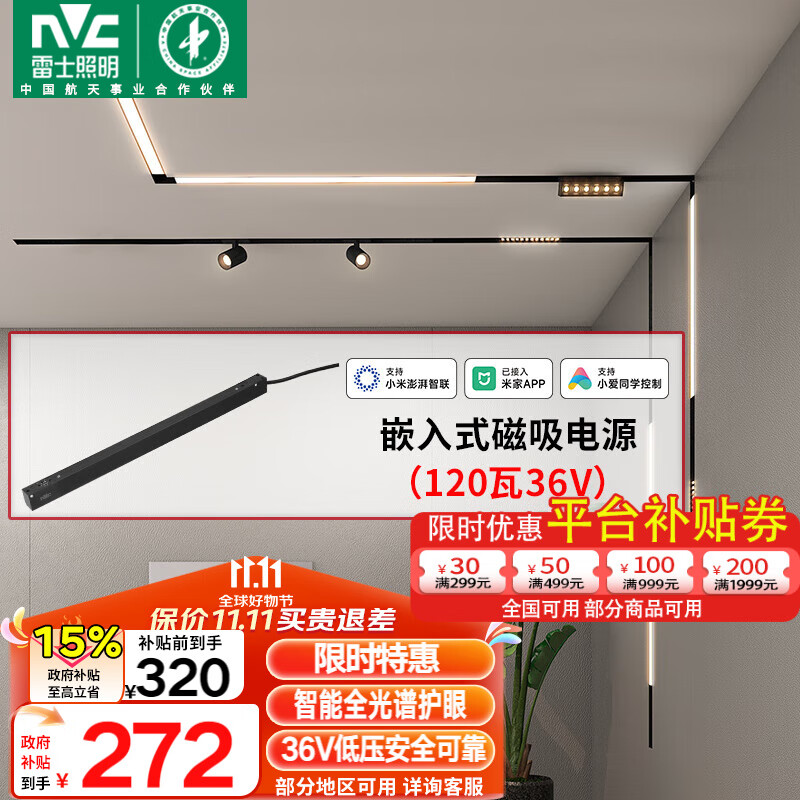 雷士(NVC)磁吸轨道灯嵌入式LED全光谱客厅智能无主灯36V【低压电源】120W