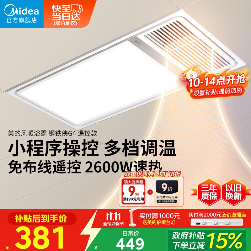 美的(Midea)浴霸风暖照明排气一体强暖大功率智能超薄暖风机卫生间浴室G4遥控