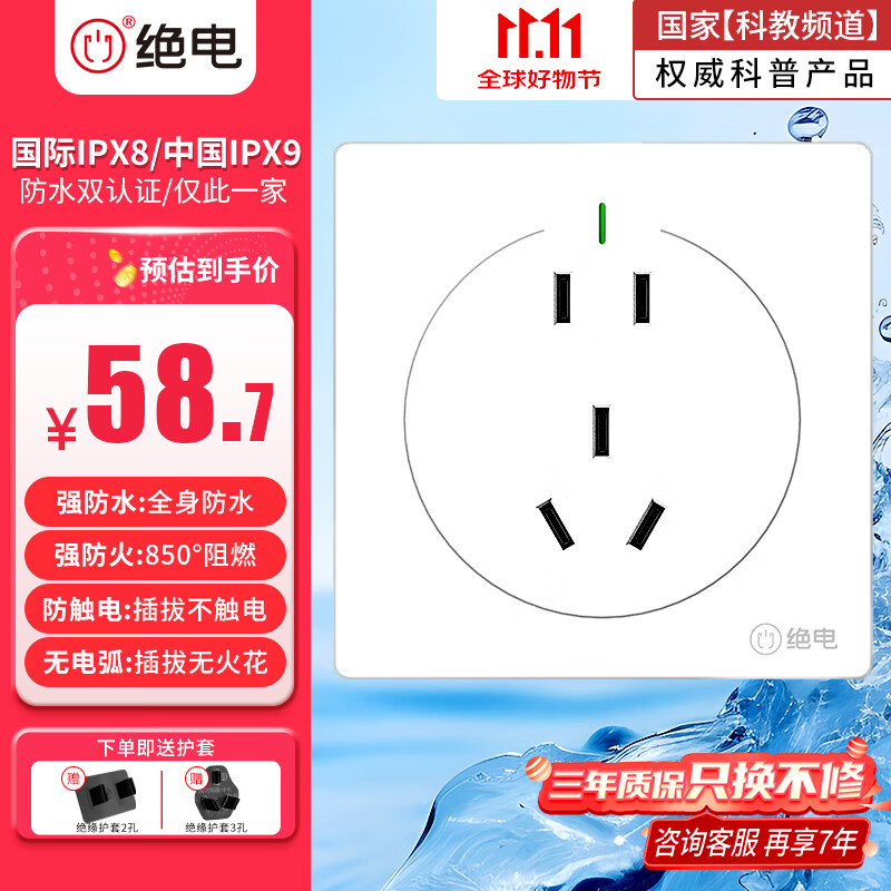 绝电防水开关插座 新国标86型面板 暗装10A五孔墙插 厨卫无惧喷淋水蒸气 国际IP68级 哑光熊猫白