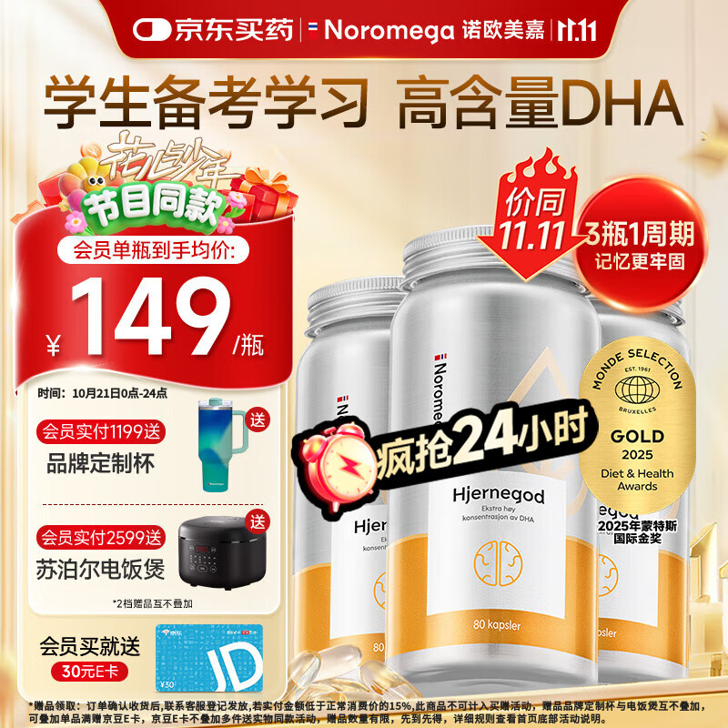 NOROMEGA深海天然补脑鱼油80粒*3瓶 大脑高浓度dha学生补脑青少年记忆力