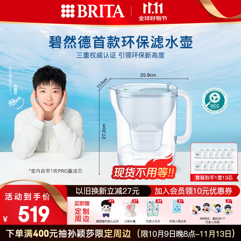 碧然德设计师Eco XL新款滤水壶家用净水去水垢过滤滤芯套装 StyleEco蓝+PRO12枚(1壶13芯)