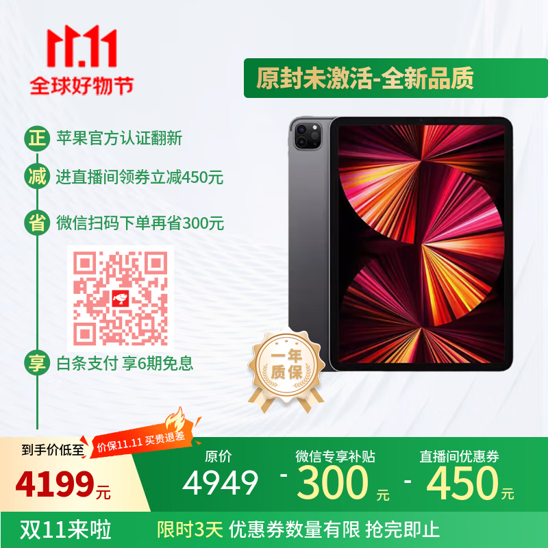 Apple苹果iPadPro M1 12.9英寸第5代原封未激活苹果官方认证翻新 支持AI 2021WIFI128G欧版灰