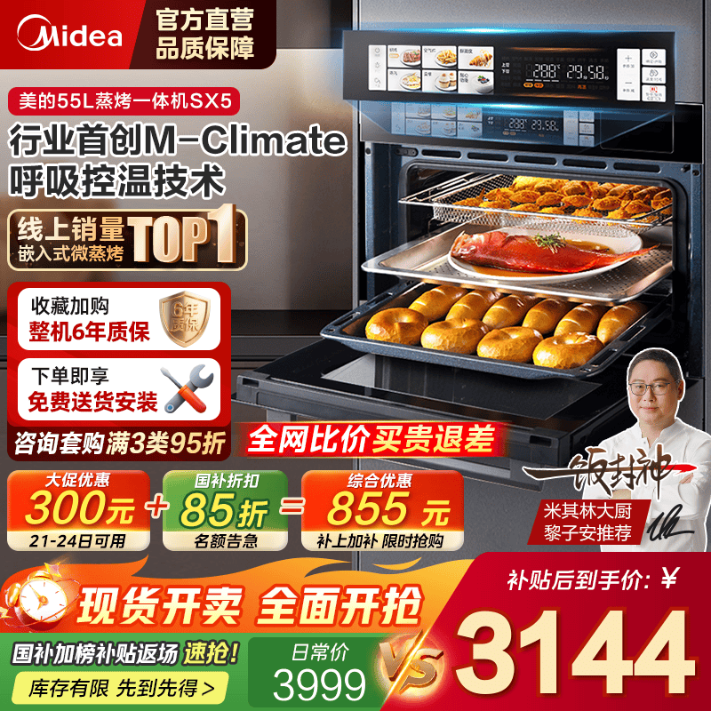 美的嵌入式蒸箱烤箱一体机SX5 55升专业蒸烤 杯水鲜蒸/温湿智控/涡轮热风/ 蒸烤炸炖4合1体机 SX5