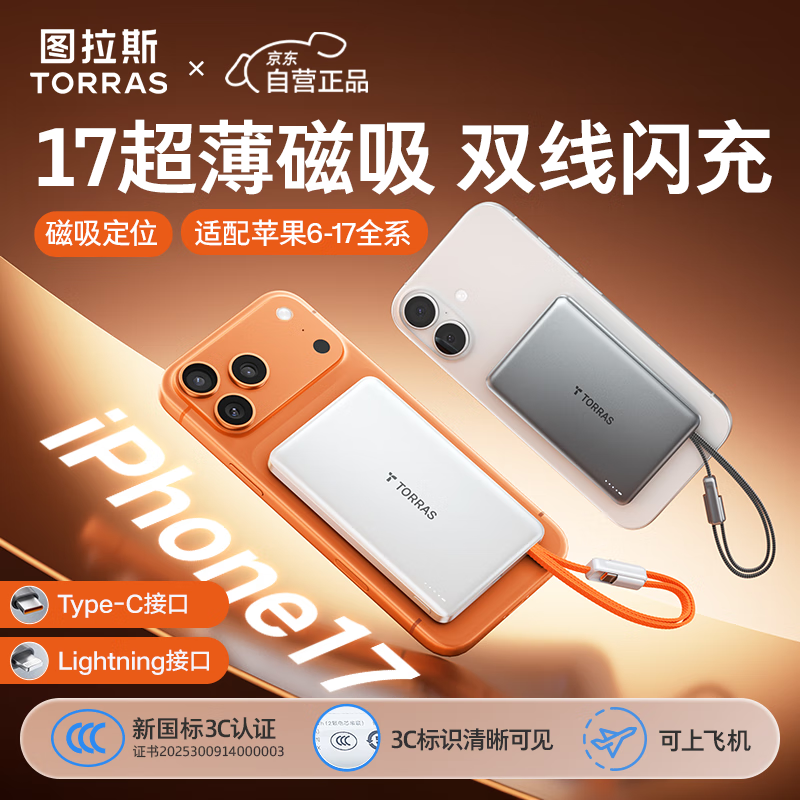 图拉斯充电宝【Air超薄】3C认证可上飞机自带双线可磁吸10000毫安大容量低温快充移动电源适用iPhone17-6