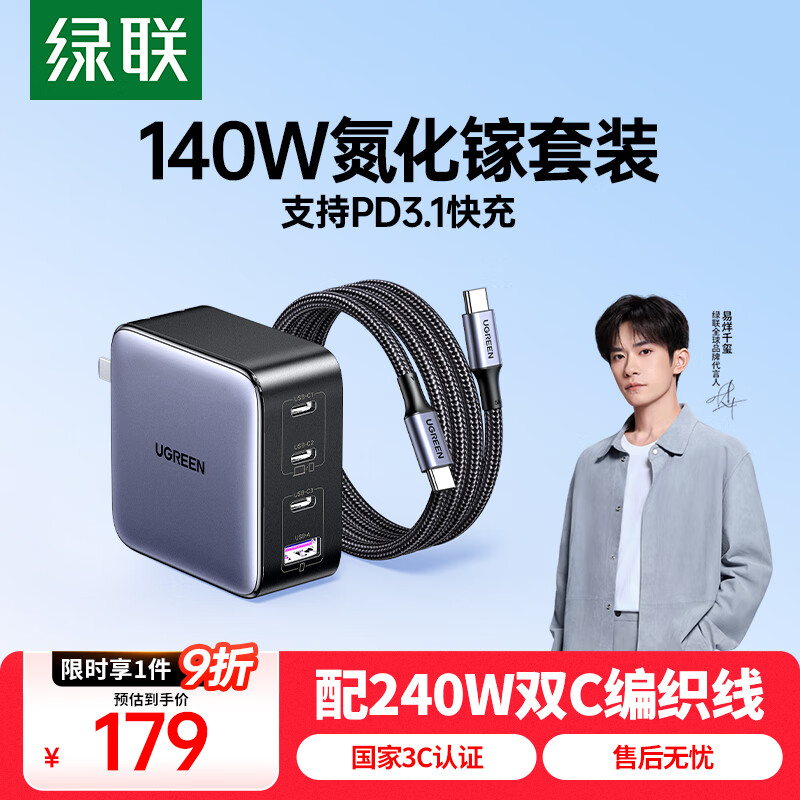 绿联140W氮化镓充电器套装Type-C多口快充头兼容PPS/PD100W苹果小米17手机MacbookPro笔记本电脑240W线
