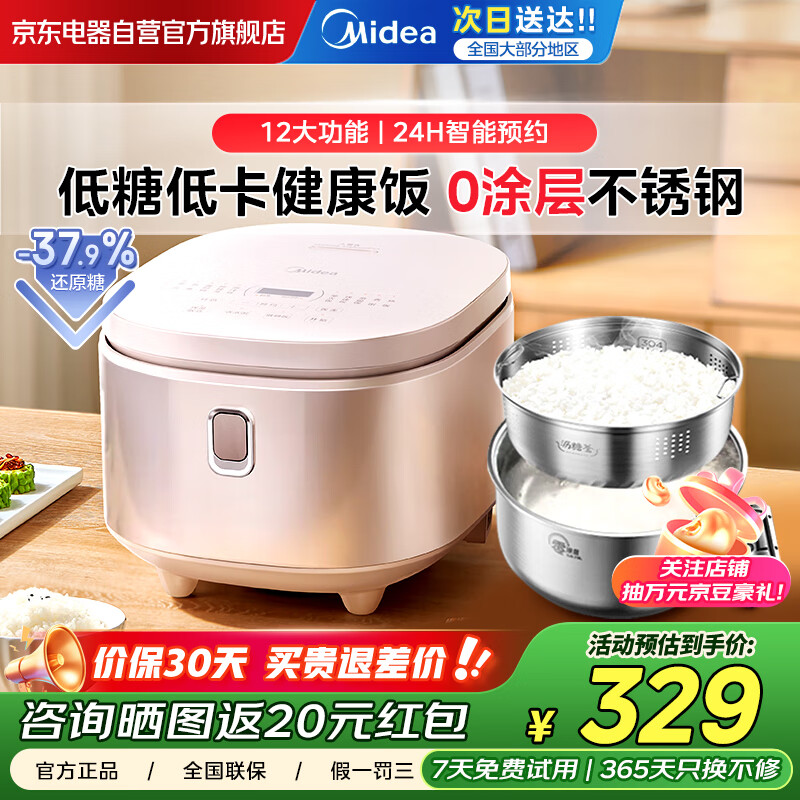 美的(Midea)低糖电饭煲 4L无涂层电饭锅家用智能米汤分离沥米饭煲316L不锈钢3-8人多功能微压蒸饭锅MB-4E62LS