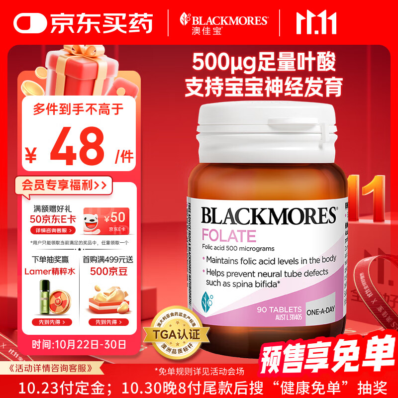 澳佳宝Blackmores天然叶酸 无碘配方 孕妇备孕高纯度500μg叶酸片90片
