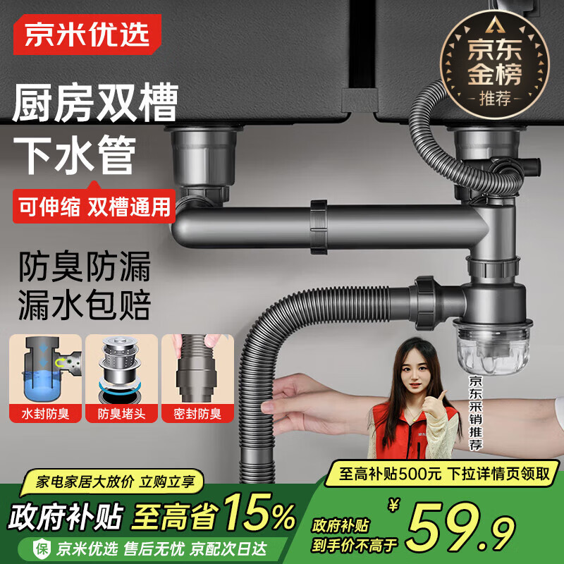 京米优选【国家补贴15%】厨房洗菜盆双下水道套装水槽洗碗池水池下水管道
