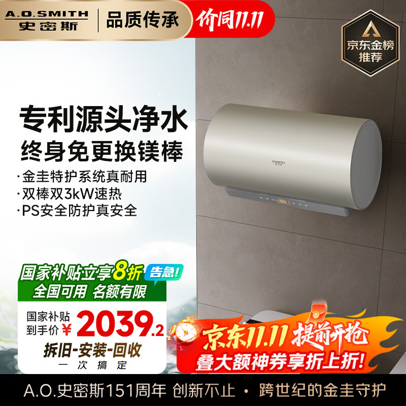史密斯(A.O.SMITH)佳尼特60升国家补贴电热水器 金圭内胆 双棒分离速热 免换镁棒 免清洗 CTE-60JC3 以旧换新