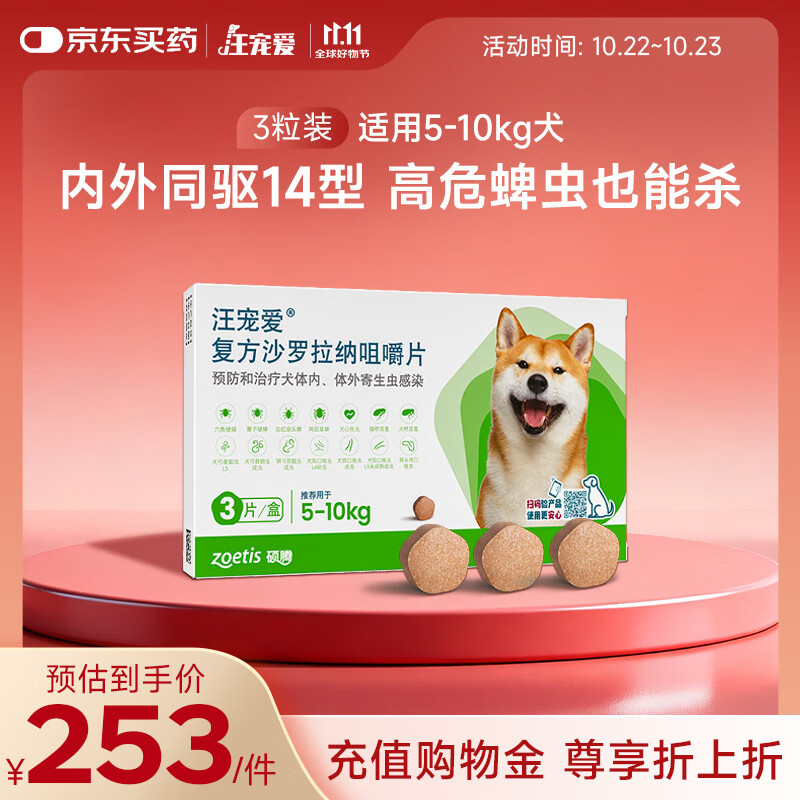 汪宠爱 体内外同驱 狗狗内服驱虫跳蚤蜱药 中型犬5-10kg*3片/盒
