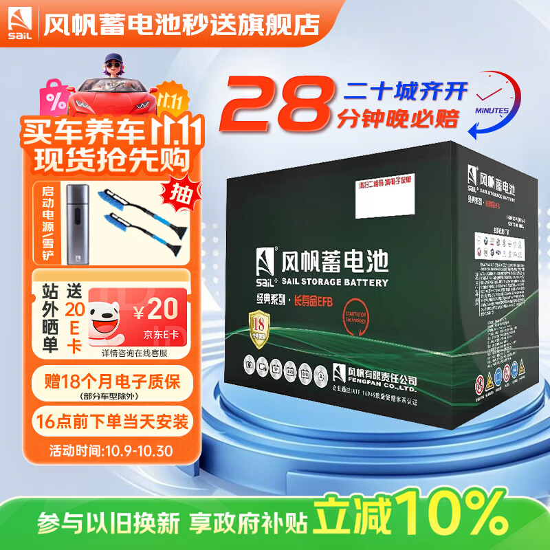 风帆汽车电瓶蓄电池EFB-H6-H长寿命系列70AH 以旧换新上门安装