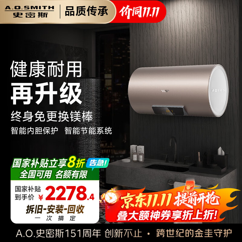 史密斯(A.O.SMITH)60升电热水器 国家补贴 专利免更换镁棒 金圭内胆 速热节能 CEWH-60ED3 一级能效