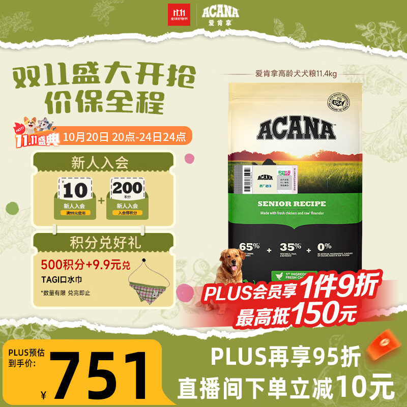 愛肯拿(ACANA)狗粮 老年高龄犬全价无谷鸡肉促消化原装进口犬粮11.4kg效期26/10