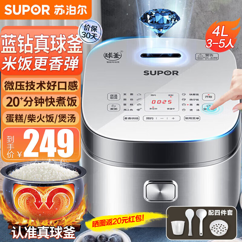 苏泊尔(SUPOR)电饭煲家用电饭锅4升大容量4-5-6人蓝钻球釜内胆多功能蒸米饭智能微压柴火饭不粘煮饭锅可做蛋糕 4L 麦香烘焙功能